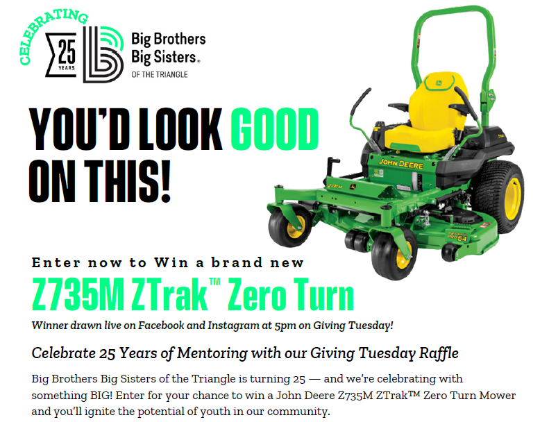 Big Brothers Big Sisters of the Triangle is turning 25 — and we’re celebrating with something BIG! Enter for your chance to win a John Deere Z735M ZTrak™ Zero Turn Mower and you’ll ignite the potential of youth in our community.